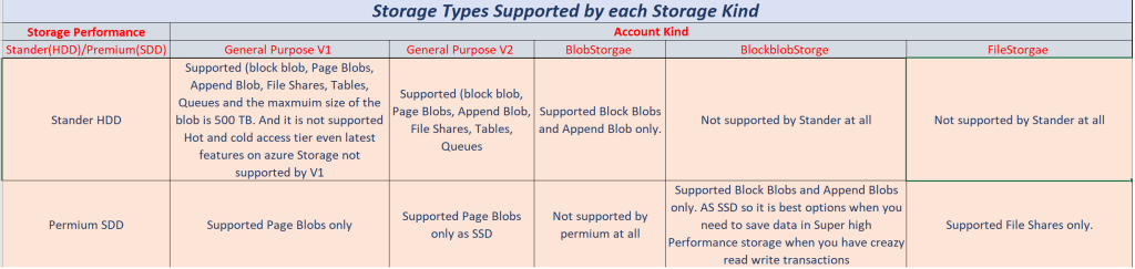 We have 5 Types (V1, V2, BlobStorage, BlockBlobStorage, FileStorge)depended on your choice for azure Storage performance (Stander or Premium) and each type from the 5 types supported some some azure Storage types from the 4 types (Blobs, Tables, file shares , Queues) and supported also some replication types from the 6 types. below image it will explain to you all of this words.
