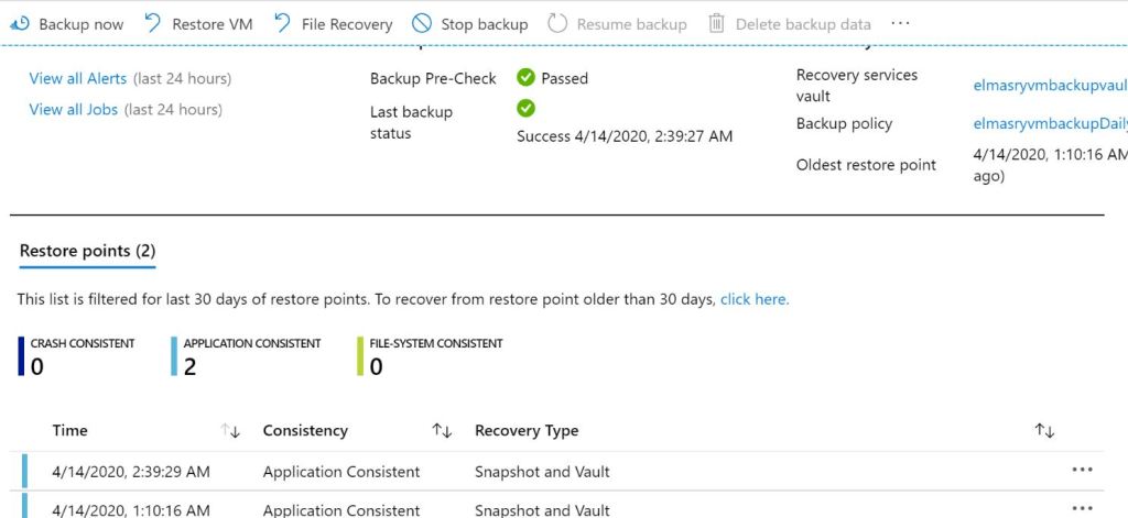 Azure Recovery service vault It is azure built in services doesn’t required any infrastructure preparation and it is supported multiple types of backup (VM , File , Disk and SQL Database) it is one of the built options in the VM , so easily when you open Azure virtual machines and select your VM you will find in the left side Backup from this point and this place you can start to manage your backup and restore process as well you can keep monitoring your backup jobs and restore jobs let us go for demo and how to do VM backup and restore it and what is the restore types supported.