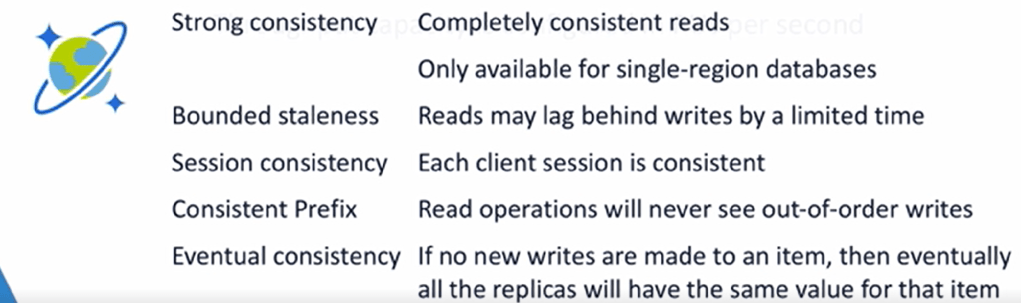 Azure Cosmos DB Consistency levels (Strong, Bounded staleness, Session, Consistent Prefix, Eventual) When you have replication between regions you should manage the data Consistency on Azure Cosmos DB based on your case and the app usage for more information check this article